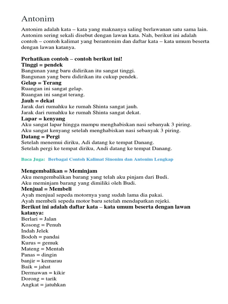 Antonim bahasa Inggris adalah lawan kata dari kata lainnya antonim sering disebut juga sebaga lawan kata. Lawan kata perbedaan kata antonim kikir. Created By Indra Hermawan 01 February 2010 Electrical Engineering —– TEST I HAFALAN ABJAD Ø KESENIAN. 300 Contoh Antonim dan Perlawanan Kata A-Z Lengkap Contoh antonim Antonim adalah suatu kata yang memiliki makna berlawanan atau bertentangan dengan kata yang lain. A teruja b gembira c cantik 7 Apakah sinonim bagi perkataan umur. 28 Full PDFs related to this paper.